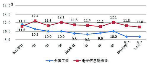 2014年1-5月,規(guī)模以上電子信息制造業(yè)增加值同比增長11.0%,高出工業(yè)平均水平2.3個百分點,但比去年同期和去年年底分別下降0.3和1.1個百分點。實現銷售產值、出口交貨值、內銷產值同比分別增長9.0%、3.2%和15.7%,比1-4月分別下降0.6、0.7和0.5個百分點。